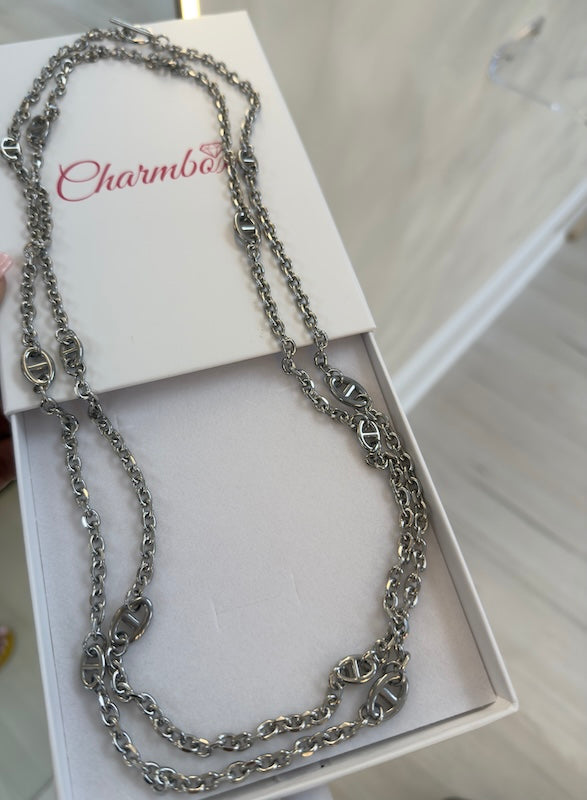 Elevate your jewelry collection with the Double Link Necklace. Its oversized length and modern chain design allow for endless styling possibilities, making it a must-have statement piece. Crafted with durable stainless steel and finished with an anti-tarnish coating, this necklace is as versatile as it is timeless.