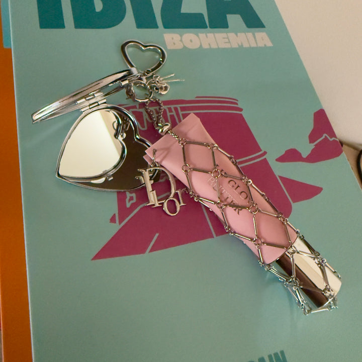 This Gloss Bag Charm is where beauty meets style. The heart-shaped mirror locket gives you instant touch-up access, while the mesh gloss sleeve keeps your favorite lip product secure in luxury. Perfect for anyone who loves a little extra shine, everywhere they go.